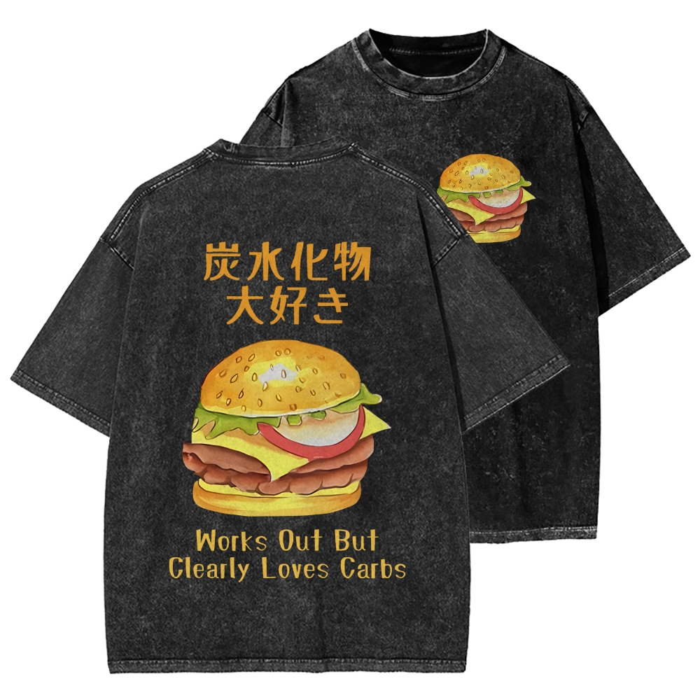 I Love Carbs Hamburger Front And Back Printing Washed T-shirt