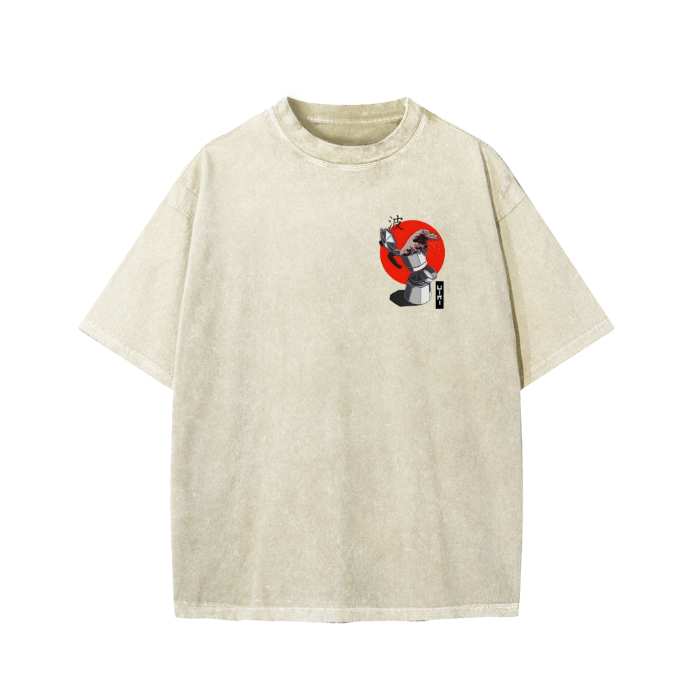 Kanagawa Coffee Front And Back Printing Washed T-shirt