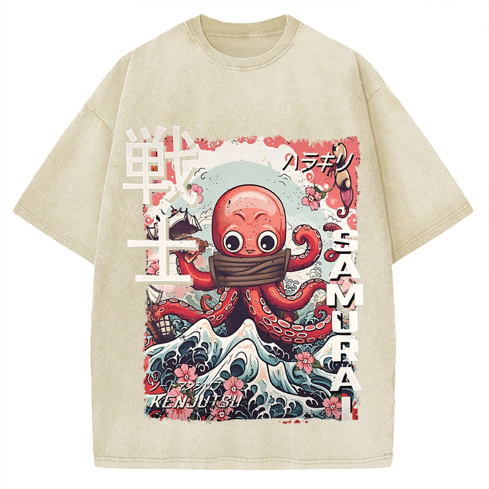 Cute Samurai Octopus Warrior Japanese Ninja Octopus Kawaii Vintage Washed T-shirt