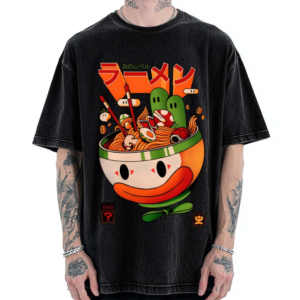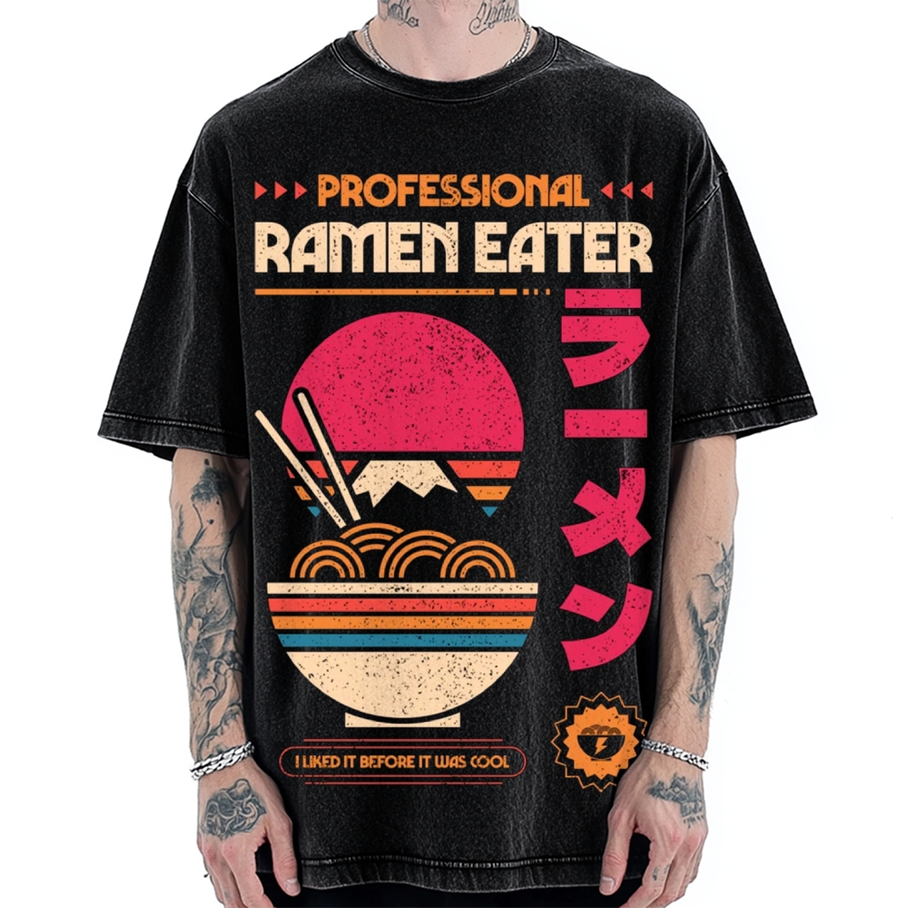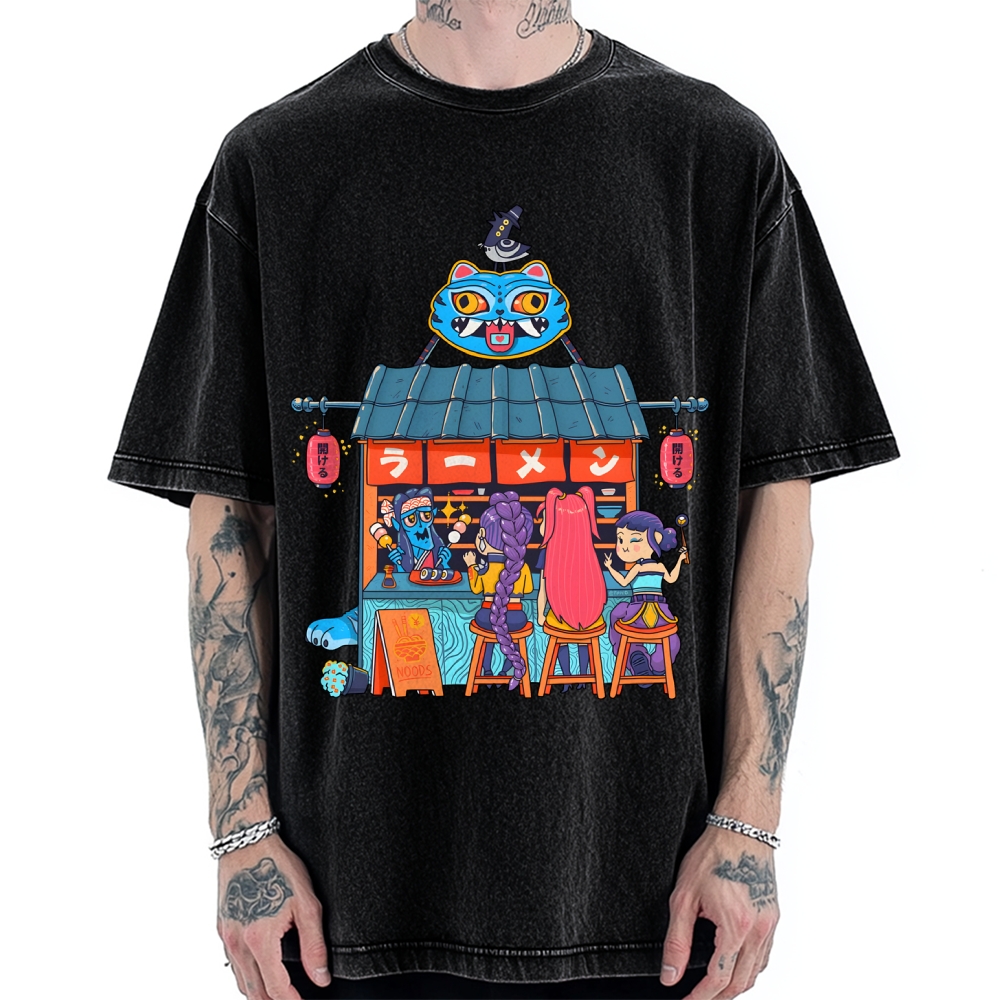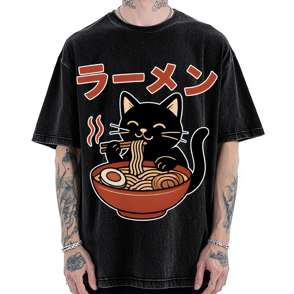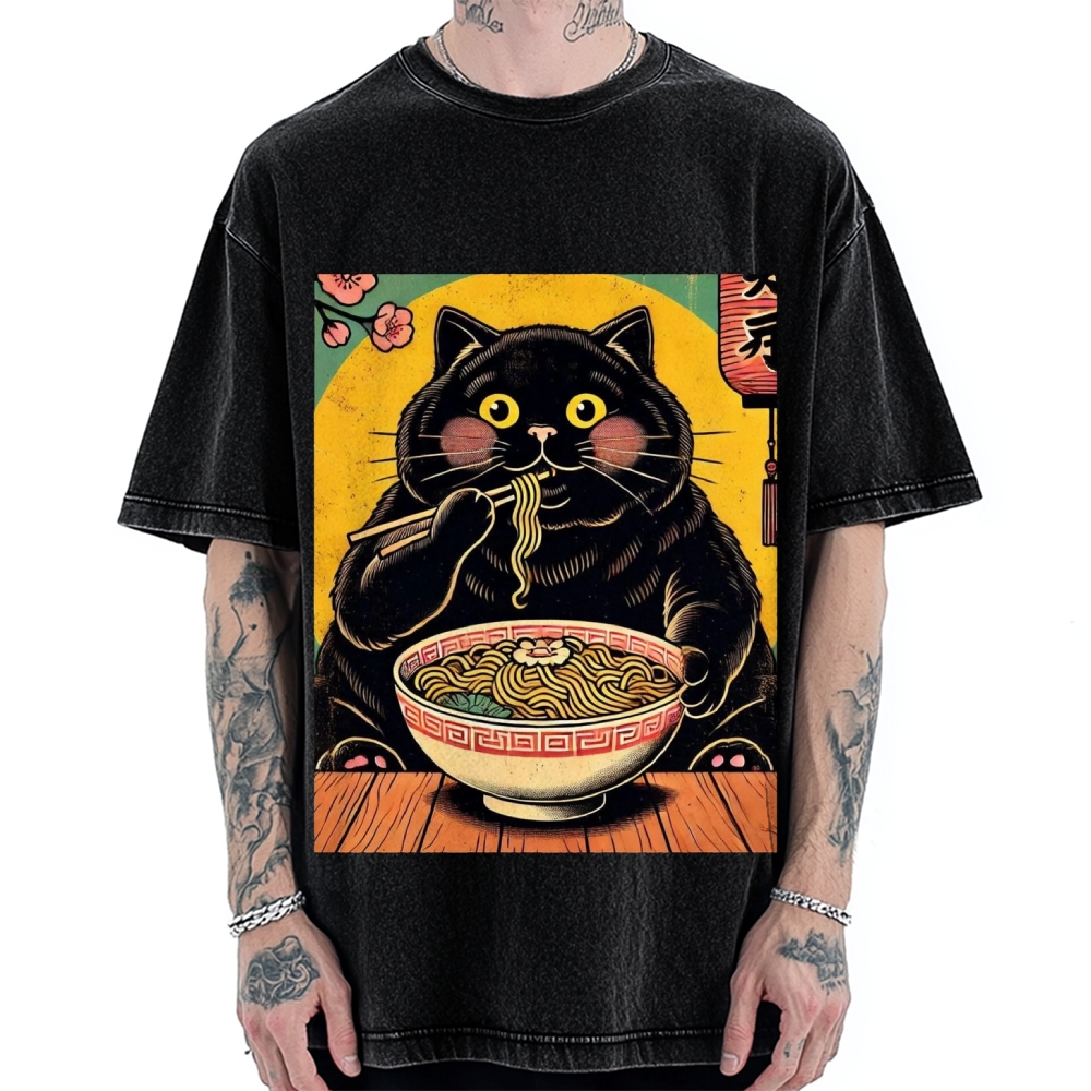 Unisex Anime Cat Ramen Japanese Funny Graphic Vintage Washed T-shirt