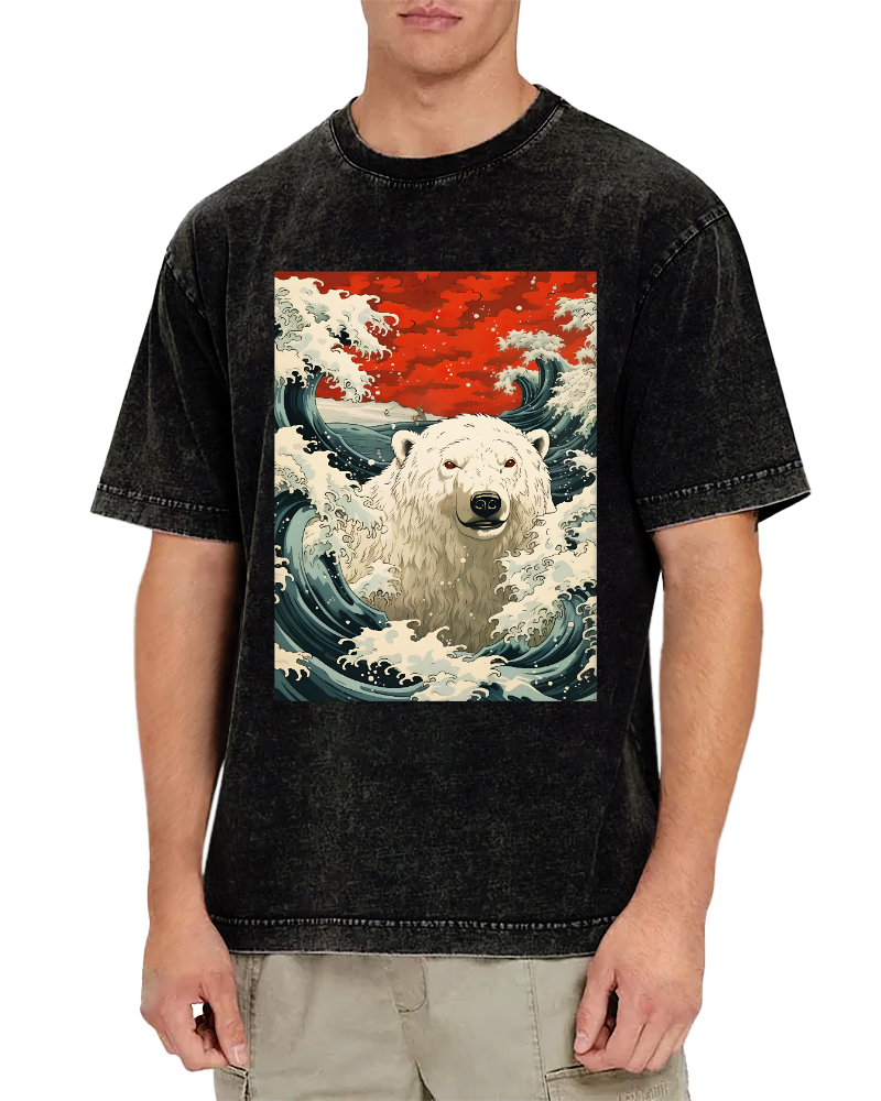 Polar Bear in the Waves, Japanese Style Vintage Washed T-shirt