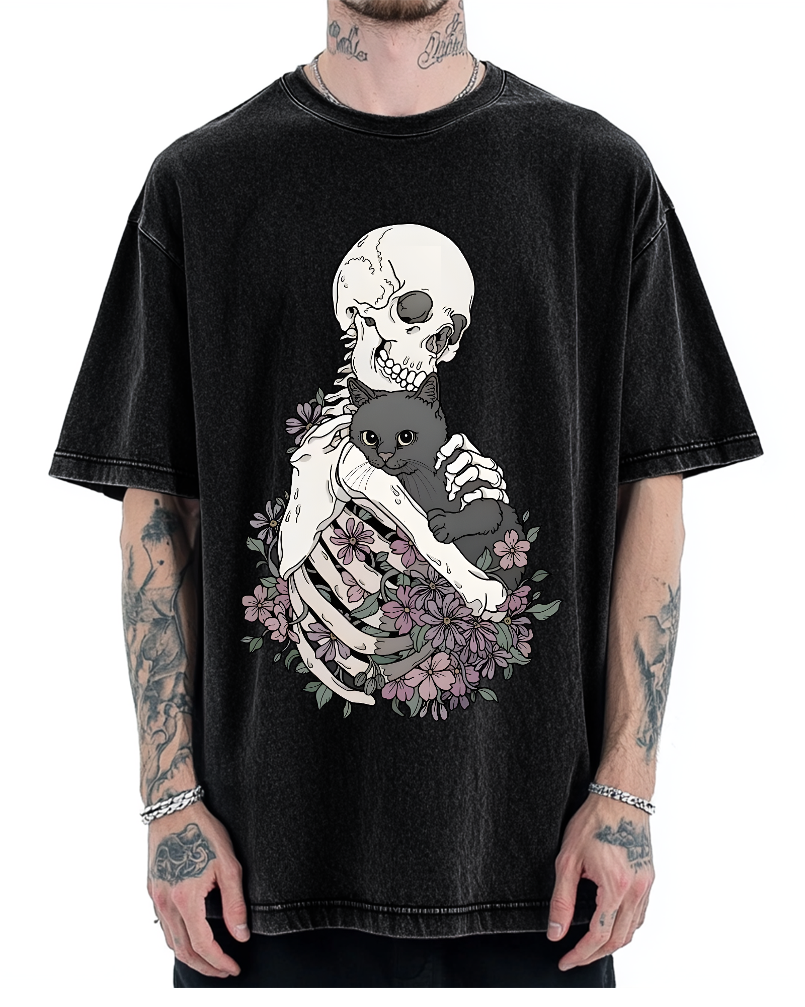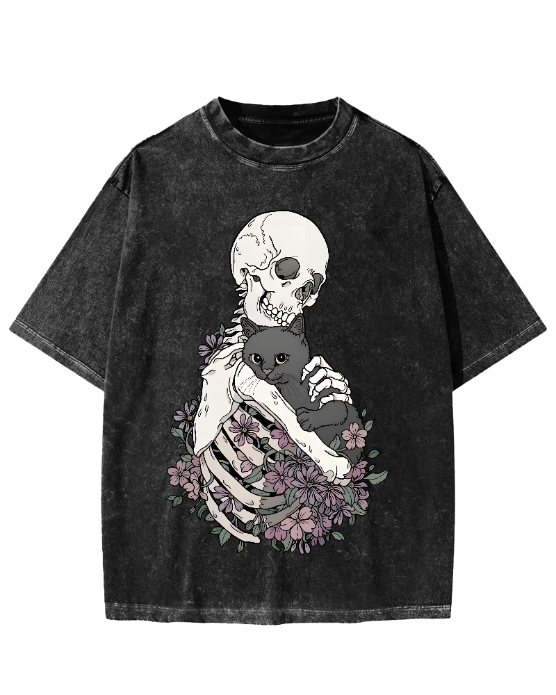Skeleton And Cat Japanese Style Vintage Washed T-shirt