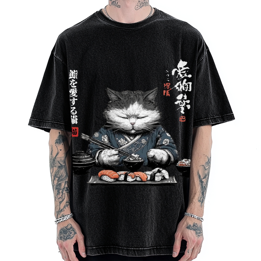 Cat Eating Sushi Japan Vintage Washed T-shirt