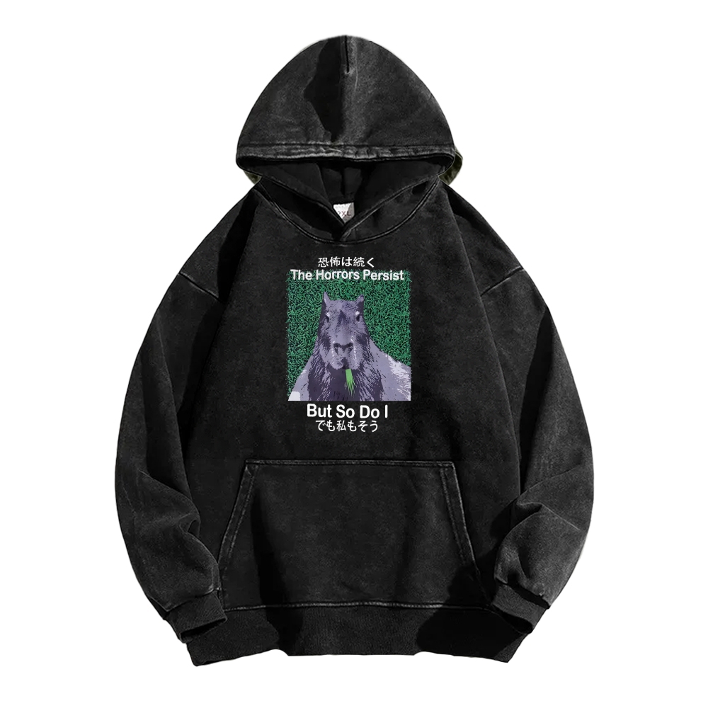 Capybara Horrors Persist Kanji Vintage Washed Hoodie