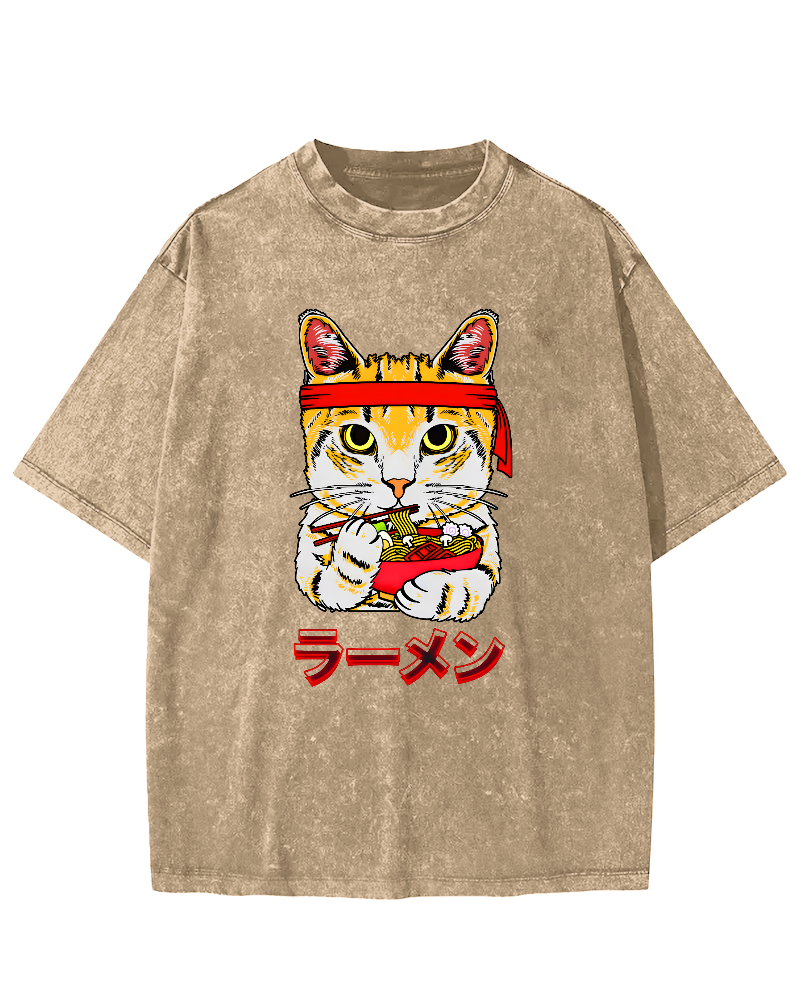 Cat Lamian Noodles Japan Vintage Washed T-shirt