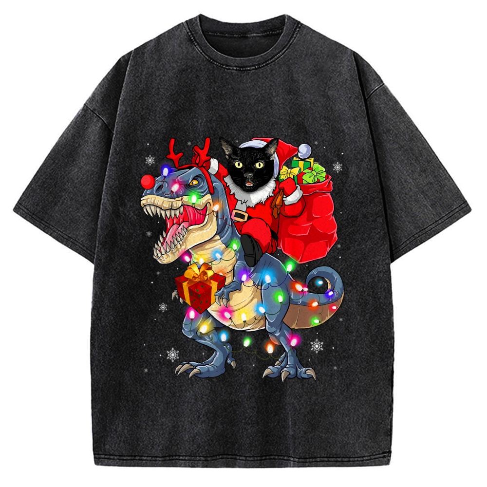 Cat Riding A Dinosaur T Rex Christmas Vintage Washed T-shirt