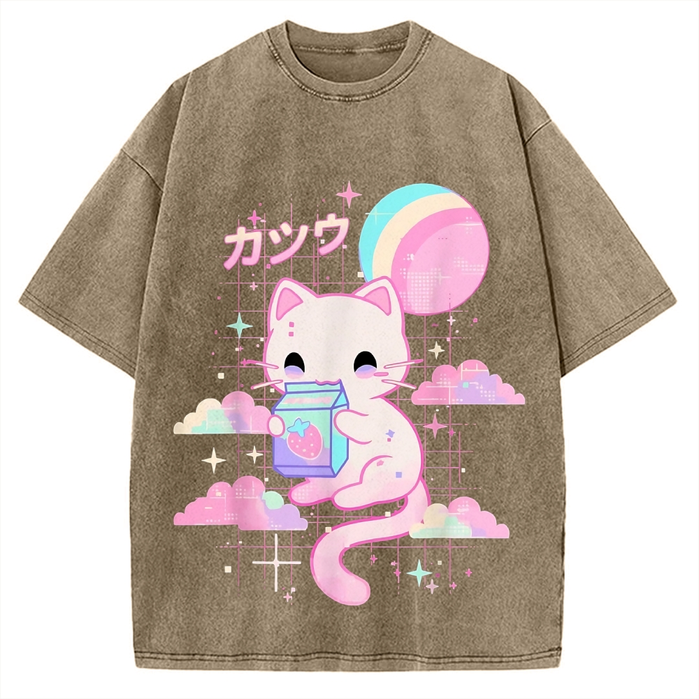 Kawaii Axolotl Strawberry Milk Japanese Anime Style Vintage Washed T-shirt