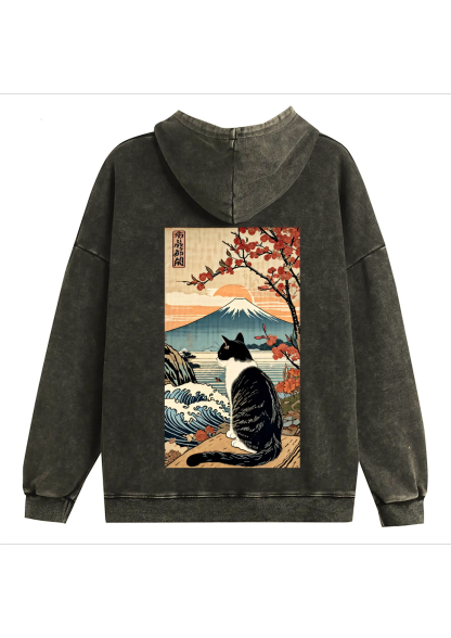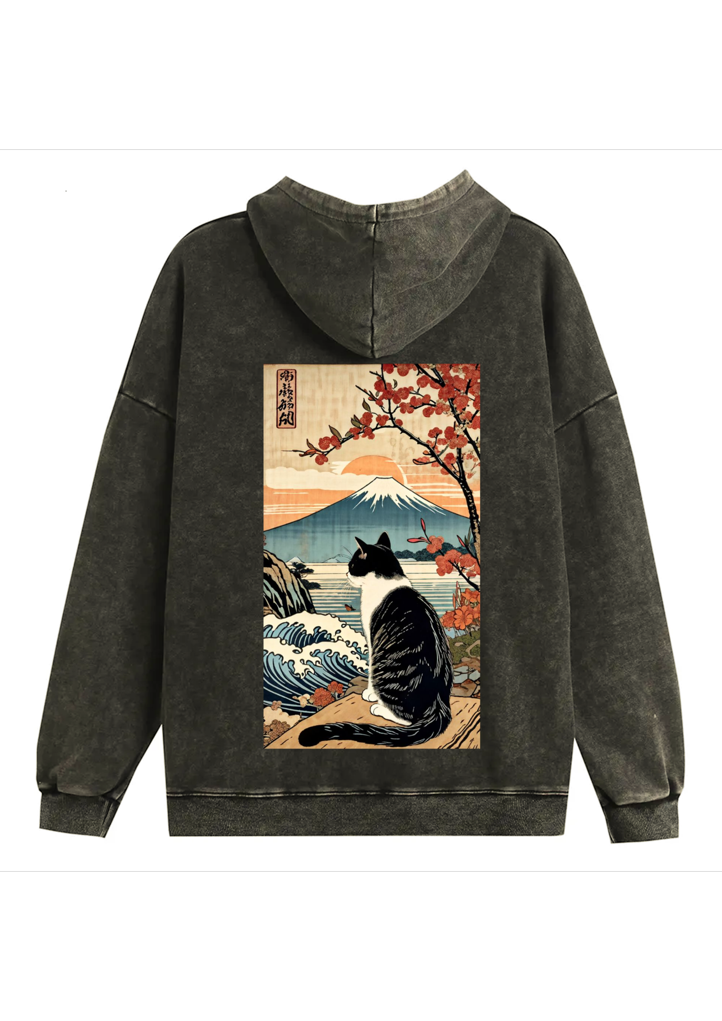 Ukiyo-e Mount Fuji Cat Vintage Washed Hoodie