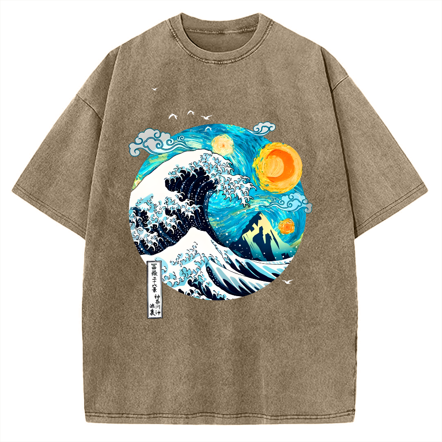 Van Gogh's Starry Night and The Great Wave on the Kanagawa River Vintage Washed T-shirt