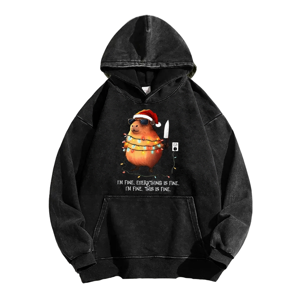Capybara I'm fine everything is fine I'm fine this is fine Merry Christmas Vintage Washed Hoodie